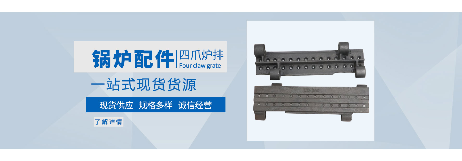 查看詳情產品有橫梁爐排,活芯爐排,往復爐排,合金爐排,四爪爐排,鱗片爐排,省煤器管,鏈條,刮板,除渣機刮板等